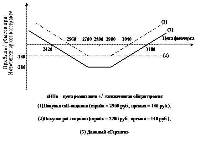 Пример 7.15. В октябре инвестор покупает декабрьский 2800 руб. call-опцион на фьючерс с премией 200 рублей и покупает декабрьский 2800 руб. put-опцион с премией 200 руб. Общая выплаченная премия составляет 400 руб.