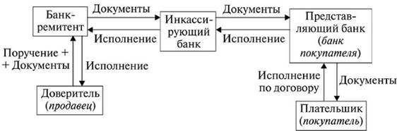Расчеты по инкассо осуществляются в соответствии с договором, согласно которому лицо, имеющее право требовать осуществления платежа (доверитель), поручает банку, в котором данное лицо имеет счет (банк-ремитент[70]), передать лицу, обязанному осуществить платеж или акцепт переводного векселя (плательщик), через банк плательщика (представляющий банк) документы, если получен платеж или акцепт переводного векселя (рис. 4.1). Банк гарантирует продавцу, что передаст покупателю такие документы при оплате товара, однако не гарантирует, что платеж будет точно произведен, поскольку не принимает кредитный риск на себя.