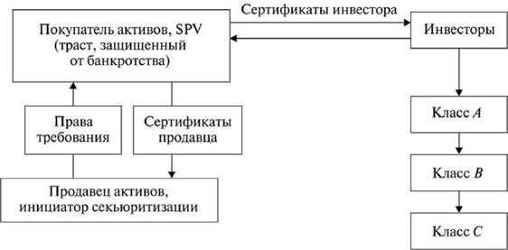 Схема типичной сделки секьюритизации с учетом рассмотренных выше принципов представлена на рис. 5.2. Выпуск в примере структурирован на три субординированных класса бумаг: А, В, С. Денежные потоки будут направляться обладателям каждого из классов бумаг по старшинству: сначала держателям бумаг класса А, затем - класса В, только потом - класса С. Как правило, сначала выплачиваются проценты, а затем - основной долг. Держатели бумаг класса В не получат процентных платежей, пока не будут погашены бумаги класса А. В аналогичной последовательности производятся платежи по возврату основного долга.