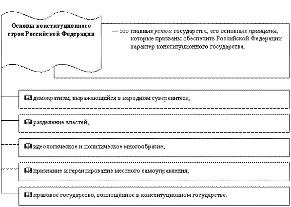 Итак, конституционный строй – это система органов государственной власти, местного самоуправления, общественных объединений, предпринимательских и некоммерческих организаций, признающих человека, а также его права высшей ценностью. Конституционный строй строится и функционирует на основе закрепленных в первой главе Конституции РФ принципах. Этот строй проявляется в деятельности государства, общества и реально существует в объективном мире. Он – материально осязаемое проявление закрепленных в Конституции РФ теоретических постулатов.