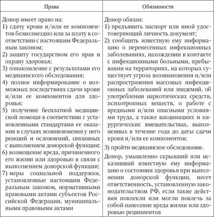 Донором может быть дееспособное лицо, являющееся гражданином РФ, либо проживающим на территории РФ на законных основаниях не менее одного года иностранным гражданином или лицом без гражданства, достигшее возраста восемнадцати лет или приобретшее полную дееспособность до достижения им возраста восемнадцати лет в соответствии с законодательством РФ, изъявившее добровольное желание сдать кровь и/или ее компоненты, прошедшее добровольно медицинское обследование и не имеющее медицинских противопоказаний для сдачи крови и/или ее компонентов. Права и обязанности доноров в РФ прописаны в ст. 12 Закона (табл. 2.1).