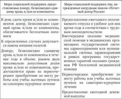 Доноры, сдавшие безвозмездно кровь и/или ее компоненты сорок и более раз или плазму крови шестьдесят и более раз, награждаются нагрудным знаком «Почетный донор России». Меры социальной поддержки, предоставляемые донору, безвозмездно сдавшему кровь и/или ее компоненты, представлены в табл. 2.2.