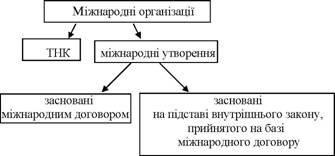 В цьому полягає насамперед економічний зміст структури ТНК, котра мислиться як така, що здійснює основну частину своїх операцій за межами країни, де вона зареєстрована і має мережу відділень, філій, підприємств3. Містке визначення надав ТНК професор Оксфордського університету С. Лалл, охарактеризувавши їх як значні компанії, що здійснюють під своїм контролем прямі інвестиції в декількох країнах4. В літературі їх часто називають по- різному — «багатонаціональні монополії», «багатонаціональні корпорації», «глобальні», «понаднаціональні», «міжнародні монополії» тощо.Слід розрізняти ТНК і міжнародні утворення, які, в свою чергу, можуть бути двох видів: такі, що засновані безпосередньо міжнародним договором (Міжнародний банк реконструкції та розвитку) і на підставі внутрішнього закону, прийнятого на базі міжнародного договору (рис. 2).
