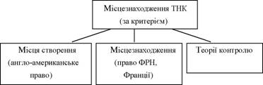 Розгалуженість структури ТНК ставить на порядок денний питання про визначення її місцезнаходження, щ эдо чого випрацювано різні критерії: місця її створення, місцезнаходження, теорії контролю (рис 4).
