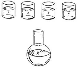Некоторые правила. Количество реактивов и порядок их смешивания не играет роли. Возможно, вам будет легче решить задачу, если представить ее наглядно, как показано на рис. 4.3. Сделайте паузу, пожалуйста, и подумайте, как подойти к решению этой задачи. Не продолжайте чтение, пока вы не запишете все действия, которые вы считаете необходимыми.