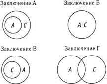 Один из способов проверки истинности заключения основан на использовании круговых диаграмм, которые отражают связи между тремя терминами (А, В, С или любыми элементами, которые мы вставим на пропущенные места).