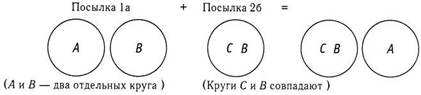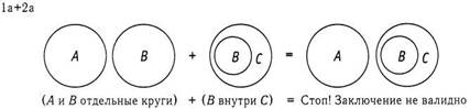 Существует несколько возможных сочетаний 1а и 2в, и нам надо проверить все способы взаимного расположения кругов, при которых А и В — два отдельных круга, и В находится внутри С. Если вы найдете хотя бы одну комбинацию 1 а+2в, которая противоречит заключению «Ни одно А не есть С», то вы можете прекратить процесс проверки комбинаций и сделать вывод о том, что заключение не валидно.