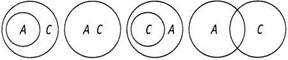 При проверке всех возможных комбинаций помните, что существует пять возможных вариантов взаимного расположения двух кругов, а) А находится внутри В\ б) В находится внутри А, в) А и В частично накладываются друг на друга; г) А и В не накладываются друг на друга (два отдельных круга), и д) А и В полностью совпадают (изображаются одним кругом) Эти пять вариантов показаны на рисунке.