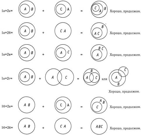 Здесь ситуация несколько более запутанная, поскольку существует несколько возможных способов сочетаний 1а с 2в, и нам необходимо проверять эти способы, пока мы не переберем все сочетания или не найдем хотя бы одно, противоречащее заключению. Давайте нарисуем все варианты взаимного расположения кругов, при котором А находится внутри В и С находится внутри В.