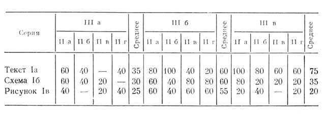 Всего испытуемые были подразделены на 36 (3 X 3 X 4) разных групп, отличающихся друг от друга формой предлагаемого материала, вопросом задачи и даваемой инструкцией. В каждую группу было включено пять человек, и в эксперименте, таким образом, приняли участие 180 испытуемых. Предполагалось, что вариация указанных трех параметров создаст у различных групп испытуемых разное отношение к задаче, что, в свою очередь, может проявиться в разной результативности испытуемых разных групп.