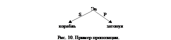 Для описания конкретных ситуаций надо использовать более детализированные структуры, отражающие разные типы взаимосвязей между элементами. С этой целью были предложены так называемые пропозициональные сети. Простейшим их элементом является связка «субъект» (S) – «предикат» (P). Субъект – это то, относительно чего делается какое-то утверждение, предикат – то, что о субъекте утверждается. Обычно, грамматически субъект – это подлежащее, выражаемое существительным, предикат – сказуемое, выражаемое глаголом. Например, субъект – корабль, предикат – затонул, а все событие (эпизод Эn ) описывается схемой: