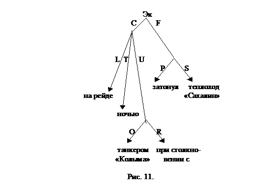 Для более сложных ситуаций используется большее число типов связей. Например, ситуация «Ночью на рейде при столкновении с танкером «Колыма» затонул теплоход «Сахалин»» будет описываться такой схемой: