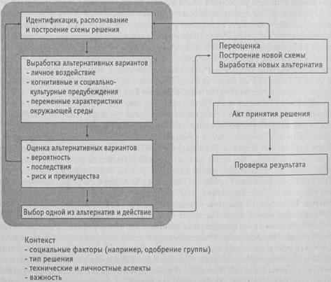 дый из которых представляет собой один из компонентов, и нескольких стрелок, которые говорят о рекурсивной (повторяющейся) природе процесса. Эти блоки помещены в серое поле, отображающее общий контекст, в котором протекает процесс принятия решения. Первым этапом принятия решения является этап осознания и понимания того, что решение вообще должно быть принято. Затем следует этап выработки альтернативных вариантов, которые могут привести к достижению поставленных целей или иному желательному результату принятого решения. Как правило, каждая альтернатива имеет свои собственные «за» и «против». Задача человека, принимающего решение, заключается в том, чтобы выбрать наилучшее возможное решение. Определение того, что является «лучшим», требует специальной фазы оценки, во время которой «лучшее» часто оказывается понятием относительным — лучшее для кого? И по каким критериям? Лучшее в ближайшем будущем или в отдаленном будущем?
