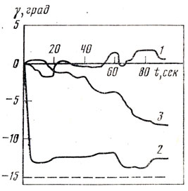 При выраженной "болезни укачивания" у одних испытуемых качество слежения за вертикалью долго удерживалось на относительно высоком уровне, но в какой-то момент резко снижалось. "Держался до последнего, больше не удается сохранять ощущения вертикали" (из отчета испытуемого Д.). У других испытуемых нарастание ошибки в установке "субъективной вертикали" могло происходить синхронно с ухудшением самочувствия.