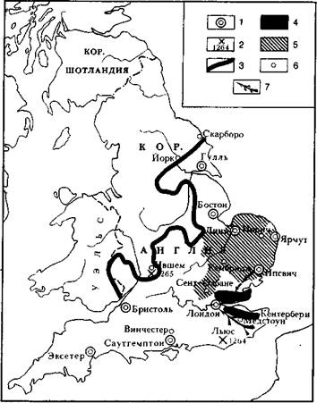 1 — наиболее крупные центры вывоза шерсти и тканей в XIII — XIV вв.; 2 — крупнейшие сражения периода баронской войны; 3 — северная граница восстания 1381 г; 4 — район начала восстания; 5 — район наиболее активных действий восставших; б — города, принявшие участие в восстании; 7 — поход крестьян на Лондон.