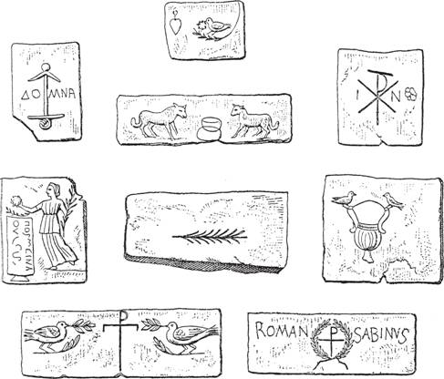 Раннехристианская символика. Устойчивым символом становятся голубь, пальмовая ветвь и монограмма Христа. Но также сохраняется римская символика - Ника, триумфальные венки и пр.