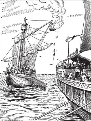 Применение «греческого огня» в морском бою византийскими кораблями (греческий огонь - зажигательный состав, который, предположительно включал серу, селитру, нефть, смолу и другие вещества.)