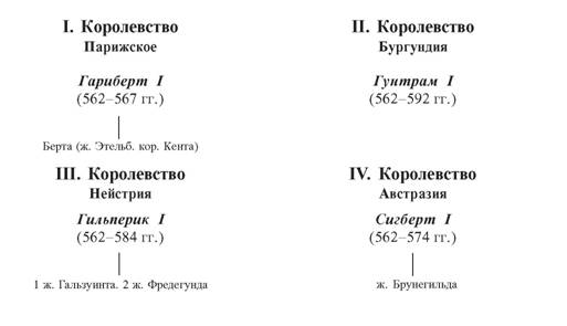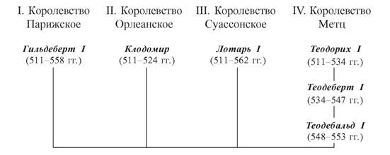 Первый раздел монархии Клодовея. 511-562 гг. Клодовей, умирая, в 511 г., разделил свои владения между детьми.
