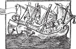 Крестоносцы в море. На одном из кораблей - флаг с навершием в форме креста.