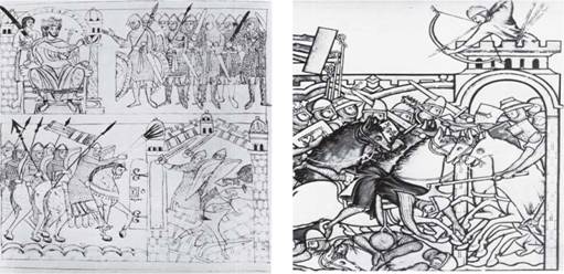 Часть расписанных окон Сен-Дени (близ Парижа), сейчас утерянных. Они были разрисованы в XII в., и эти репродукции отображают сцены из первого Крестового похода. Справа на обеих иллюстрациях находятся сельджуки, которых средневековый художник изобразил сильно похожими на европейцев, что являлось обычной практикой для того периода. Однако на одной из фигур в каждой иллюстрации была сделана попытка точно воспроизвести доспехи, носимые сельджуками в эру Крестовых походов