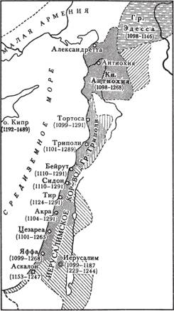 Государства крестоносцев на Ближнем Востоке. Редкой штриховкой показана территория крестоносных государств в период их наибольшей экспансии (XI-XII вв.); частой штриховкой - в первой половине XIII в.; указаны годы установления и падения власти крестоносцев