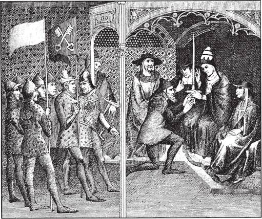 Папа Александр III (1159-1181 гг.) вручает меч дожу Цани (1172-1178 гг.). Фреска Спинелло Спинелли (1333-1410 гг.). Сиена. Дворец коммуны. Персонажи одеты в костюмы XIV в.