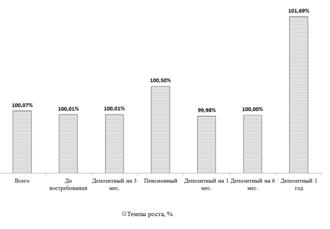 Расчёт показателей динамики описывает для всех видов счетов рост (от 1,69% для депозитного на 1 год до 0,01% для вкладов до востребования и пенсионного), кроме вклада «Депозитный на мес.», который снизился всего на 0,02%.