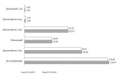 Очевидно представление того, сколько в рублях приходится каждого вида вкладов на 1 рубль вклада депозитный на 1 год, так самый большой показатель координации для вклада «До востребования»: более 120 рублей на 1 января 2014 и более 118 рублей на 1 января 2015 г.118 на 1 рубль вклада «Депозитный на 1 год».