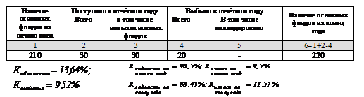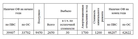 Построенная расчётная таблица основывается на использовании видов оценки основных фондов и служит базой для расчёта коэффициентов. Так Наличие ОФ на конец года по ПВС = Наличие ОФ на начало года по ПВС+Поступление-Выбытие (всего), а Наличие ОФ на конец года по ОС представляет собой результат алгебраического суммирования Наличия ОФ на начало года по ОС, Поступления, Выбытия по остаточной стоимости, Амортизационных отчислений за год и Стоимости капитального ремонта.