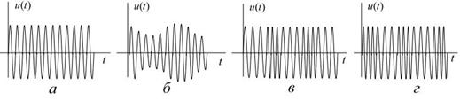 Рис. 1.6. Несущее гармоническое колебание (а) и получаемые на его основе модулированные сигналы: АМ (б), ЧМ (в) и ФМ (г)
