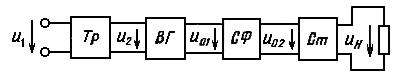 На вход выпрямителя подается переменное напряжение u1, которое с помощью трансформатора Тр изменяется до требуемого значения u2. Кроме того, трансформатор осуществляет электрическую развязку источника выпрямляемого напряжения и нагрузочного устройства, что позволяет получать с помощью нескольких вторичных обмоток различные значения напряжений u2, гальванически не связанных друг с другом. После трансформатора переменное напряжение u2 вентильной группой ВГ (или одним вентилем) преобразуется в пульсирующее напряжение u01. Количество вентилей зависит от схемы выпрямителя.