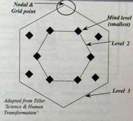 Рисунок 2.13 Модель Сети Все-ленной. Профессор Тиллер осмыс-ливает структуру 10-мерной Сети, которая связывает сеть разума с фи-зической реальностью (Уровень 3). Уровень 2 – пространство эфирной субстанции [10]. Определенные узло-вые точки, общие для многоуровневой структуры уровней структуры Сети являются точками связи, которые соединяют и передают энергии и ин-формацию между измерениями. Сог-ласно Тиллеру, Сознание и Намерение руководят этим сложным процессом! (См. Приложение к главе, № 57)