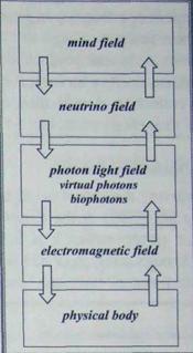 Рисунок 2.5 Петля жизнь-сознание. Согласно описанию Бирдена (Информаци-онное совещание “Эскалибур”), петля жизнь-сознание связывает поле мышления с физическим телом (механизм настройки). Промежуточные компоненты петли: поле нейтрино, поле фотон/биофотон и электромагнитное поле. Согласно Бирдену, подструктура петли может быть сконструирована, шаблонизирована или структурирована в обоих направлениях.
