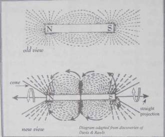 Рисунок 2.2 Старый и новый взгляд на магнетизм. При старом взгляде на магнетизм силовые линии выходят из Южного и входят в Северный полюс, или, при альтернативном рассмотрении, из Северного в Южный полюс [2]. Дэвис и Роулс разработали новый взгляд на магнетизм. Энергия двигается в обоих направлениях одноврменно. По определению Дэвиса и Роулса, “кабели сил” выражают дуальность – каждый вращается в противоположном направлении, покидая один полюс и путешествуя к другому. Образуется паттерн в виде петли восьмерки. (См. примечание к главе, № 48)