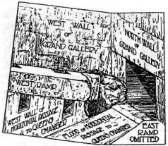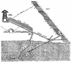 Вернувшись к месту соединения трёх проходов (восходящего коридора, Большой галереи и горизонтального коридора), люди аль‑Мамуна заметили отверстие в восточной стене, где была выломана часть пандуса (рис. 68). Из пролома короткий горизонтальный проход вёл к вертикальной шахте, которую арабы приняли за колодец. Спустившись по этому «колодцу», они обнаружили, что это всего лишь верхняя часть длинных (около 200 футов) и извилистых туннелей, которые с помощью шестифутового прохода соединяются с нисходящим коридором, обеспечивая связь между верхними и нижними помещениями пирамиды (рис. 66). По всей вероятности, нижний выход из системы туннелей был закрыт и замаскирован, чтобы тот, кто шёл по нисходящему коридору, не смог увидеть его. Люди аль‑Мамуна спустились по вертикальной шахте и разблокировали выход.