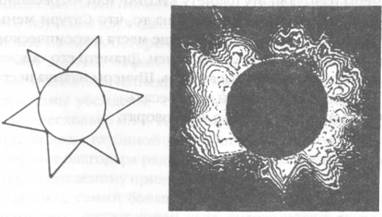 6а). Почему?В 1980 году астрономы из высокогорной обсерватории университета Колорадо сделали снимки Солнца при помощи спектральной камеры во время затмения, которое наблюдалось на территории Индии. Фотографии показали, что в результате воздействия магнитных полей солнечная корона представляет собой диск с отходящими от него треугольными лучами — что полностью совпадает с шумерским рисунком, сделанным несколько тысяч лет назад.