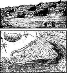 Сам выступ можно условно разделить на три части. В широком основании преобладают гигантские скальные образования, которые кто‑то превратил в огромные ступени, или площадки, и изрезал туннелями, нишами и желобами. Среднюю часть выступа занимает плоская площадка длиной и шириной в несколько сот футов. На узкой вершине, приподнятой над остальной частью выступа, сохранились остатки круглых и прямоугольных строений, под которыми проходят туннели и каналы, образующие удивительный лабиринт, прорезанный в толще скалы. Эту «освоенную» часть выступа отделяют (или защищают) от остальной три мощные зигзагообразные стены, протянувшиеся параллельно друг другу от одного края до другого (рис. 69).