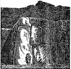 Три ряда зигзагообразных стен сложены из гигантских камней и располагаются друг за другом; каждая следующая стена немного выше предыдущей, и их общая высота достигает шестидесяти футов. Земляные насыпи за каждой стеной образуют террасы; считается, что эти насыпи использовались защитниками Саксахуамана в качестве брустверов. Самая низкая из трех стен (первая) сложена из колоссальных блоков весом от десяти до двадцати тонн. Один из камней высотой двадцать семь футов весит более 300 тонн (рис. 70). Высота многих блоков составляет около пятнадцати футов, а ширина и толщина – от десяти до четырнадцати. Как и внизу, в самом городе, поверхность этих камней тщательно отполирована, а углы закруглены. Следовательно, это не просто валуны, найденные неподалеку и использованные при строительстве, а работа искусных каменотесов.