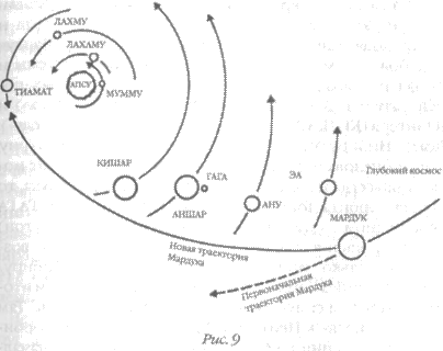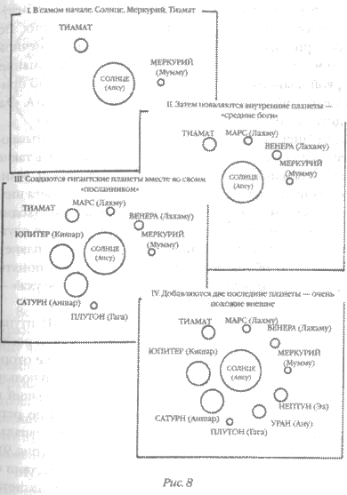 Все началось, свидетельствуют шумерские тексты, когда Солнечная система была еще молода. Первоначально она состояла из Солнца (в шумерских табличках АПСУ, что в буквальном переводе означает «тот, кто существовал с самого начала»), его маленького спутника МУМ.МУ («тот, кто был рожден», или Меркурий) и расположенной чуть дальше ТИАМАТ («дева жизни»). Постепенно Солнечная система расширялась за счет «рождения» трех пар планет: Венеры и Марса, расположенных между Мумму и Тиамат, пары гигантов Юпитера и Сатурна позади Тиамат, а также Урана и Нептуна, находящихся еще дальше от Солнца (рис. 8).