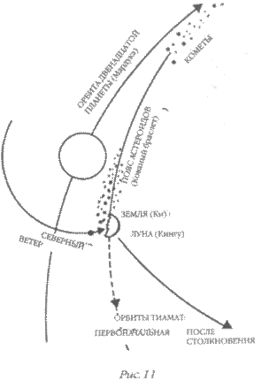 Этим действием закончилось формирование «небес», и наступила фаза создания Земли и Луны. Сначала новое столкновение разбило Тиамат на две половины. Верхняя часть, или «череп», столкнулась со спутником Нибиру/ Мардука, который носил название «Северный Ветер». Удар отбросил ее в сторону, и вместе с Кингу она полетела «по местам потаенным» — то есть по новой орбите, на которой раньше не было планеты. Так образовались Земля и Луна (рис. 11).