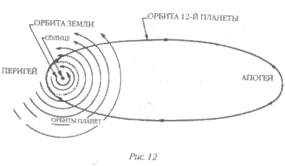 «Устроив стоянки» планетам, Нибиру/Мардук построил два «чертога» для себя. Один находился на «небесном своде» (в древних такстах так назывался также пояс астероидов), а второй «в глубине» — он получил название Эшарра («дом правителя»). Современные астрономы называют эти две точки планетарной орбиты перигеем (ближайшая к Солнцу точка) и апогеем (наиболее удаленная от Солнца точка) (рис. 12). Период вращения по этой орбите, это подтверждает масса источников, составляет 3600 лет.